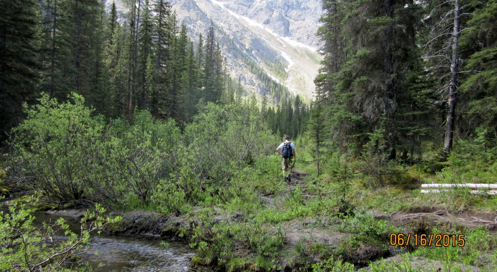 The Old Goat Glacier is not named after a Billy Goat but an old person as a joke. The trail starts from the campsite across the dam off the Spray Lakes road. Drive into the campsite and on the right is a trail head parking sign. My reference for this hike was the Copeland’s “Where the Locals Hike ” and Dafferns Vol 3. Both are outdated as you can only park in the designated parking now and not 200 meters up the gravel road. They also both talk about crossing the steam but since the flood the water flows under the rock washout from the waterfall. The Warden Station has also been removed. The rest of their descriptions are first class. Daffern suggests finding the hidden tarn and it is worth while doing so. We found it by walking down the glacier valley and dropping down into it from the clump of trees in the middle of the valley. I think there is also a small trail through the trees on the right before coming out onto the moraine. We also came down the waterfall which comes out at the bottom of the big climb at the washout area. I would not recommend doing this as Dafferens book advises.
