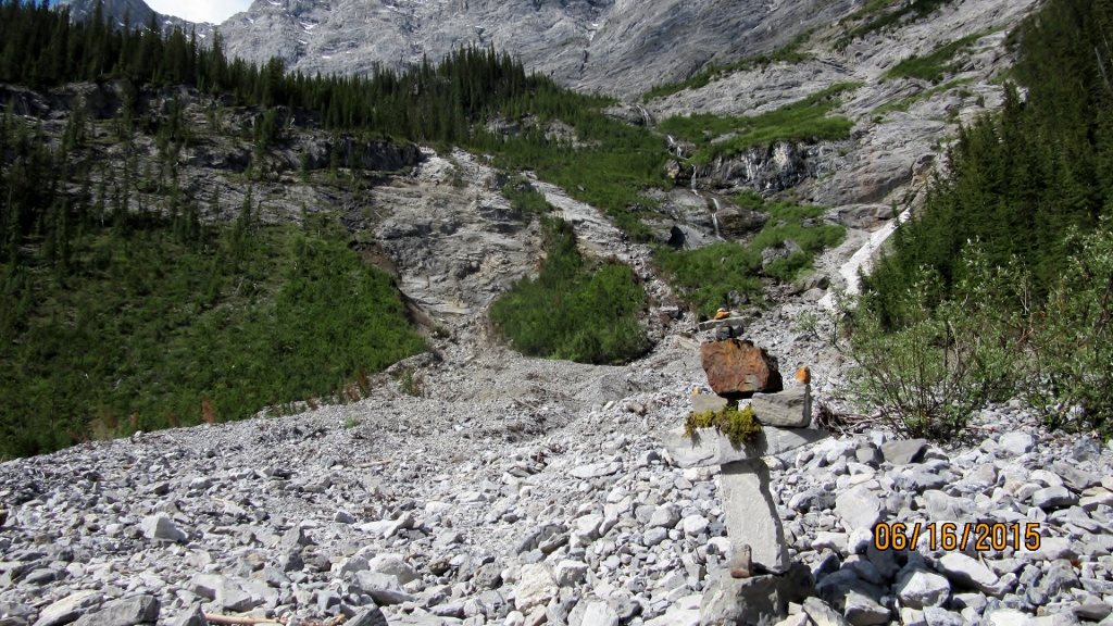 The Old Goat Glacier is not named after a Billy Goat but an old person as a joke. The trail starts from the campsite across the dam off the Spray Lakes road. Drive into the campsite and on the right is a trail head parking sign. My reference for this hike was the Copeland’s “Where the Locals Hike ” and Dafferns Vol 3. Both are outdated as you can only park in the designated parking now and not 200 meters up the gravel road. They also both talk about crossing the steam but since the flood the water flows under the rock washout from the waterfall. The Warden Station has also been removed. The rest of their descriptions are first class. Daffern suggests finding the hidden tarn and it is worth while doing so. We found it by walking down the glacier valley and dropping down into it from the clump of trees in the middle of the valley. I think there is also a small trail through the trees on the right before coming out onto the moraine. We also came down the waterfall which comes out at the bottom of the big climb at the washout area. I would not recommend doing this as Dafferens book advises.