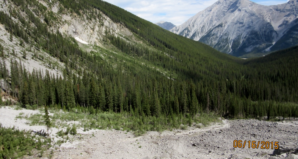 The Old Goat Glacier is not named after a Billy Goat but an old person as a joke. The trail starts from the campsite across the dam off the Spray Lakes road. Drive into the campsite and on the right is a trail head parking sign. My reference for this hike was the Copeland’s “Where the Locals Hike ” and Dafferns Vol 3. Both are outdated as you can only park in the designated parking now and not 200 meters up the gravel road. They also both talk about crossing the steam but since the flood the water flows under the rock washout from the waterfall. The Warden Station has also been removed. The rest of their descriptions are first class. Daffern suggests finding the hidden tarn and it is worth while doing so. We found it by walking down the glacier valley and dropping down into it from the clump of trees in the middle of the valley. I think there is also a small trail through the trees on the right before coming out onto the moraine. We also came down the waterfall which comes out at the bottom of the big climb at the washout area. I would not recommend doing this as Dafferens book advises.